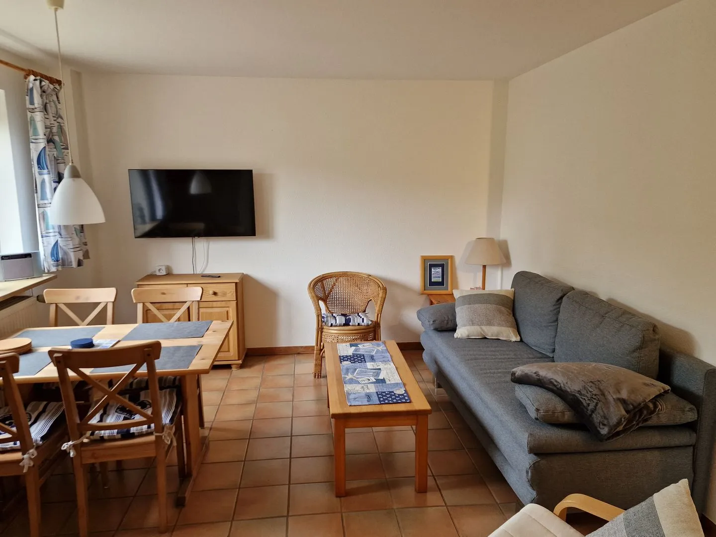 Der liebevoll eingerichtete Wohnbereich ist ideal, um nach einem erlebnisreichen Tag zur Ruhe zu kommen. Ob mit einem guten Buch oder einem Film am Abend – hier lässt es sich wunderbar entspannen.