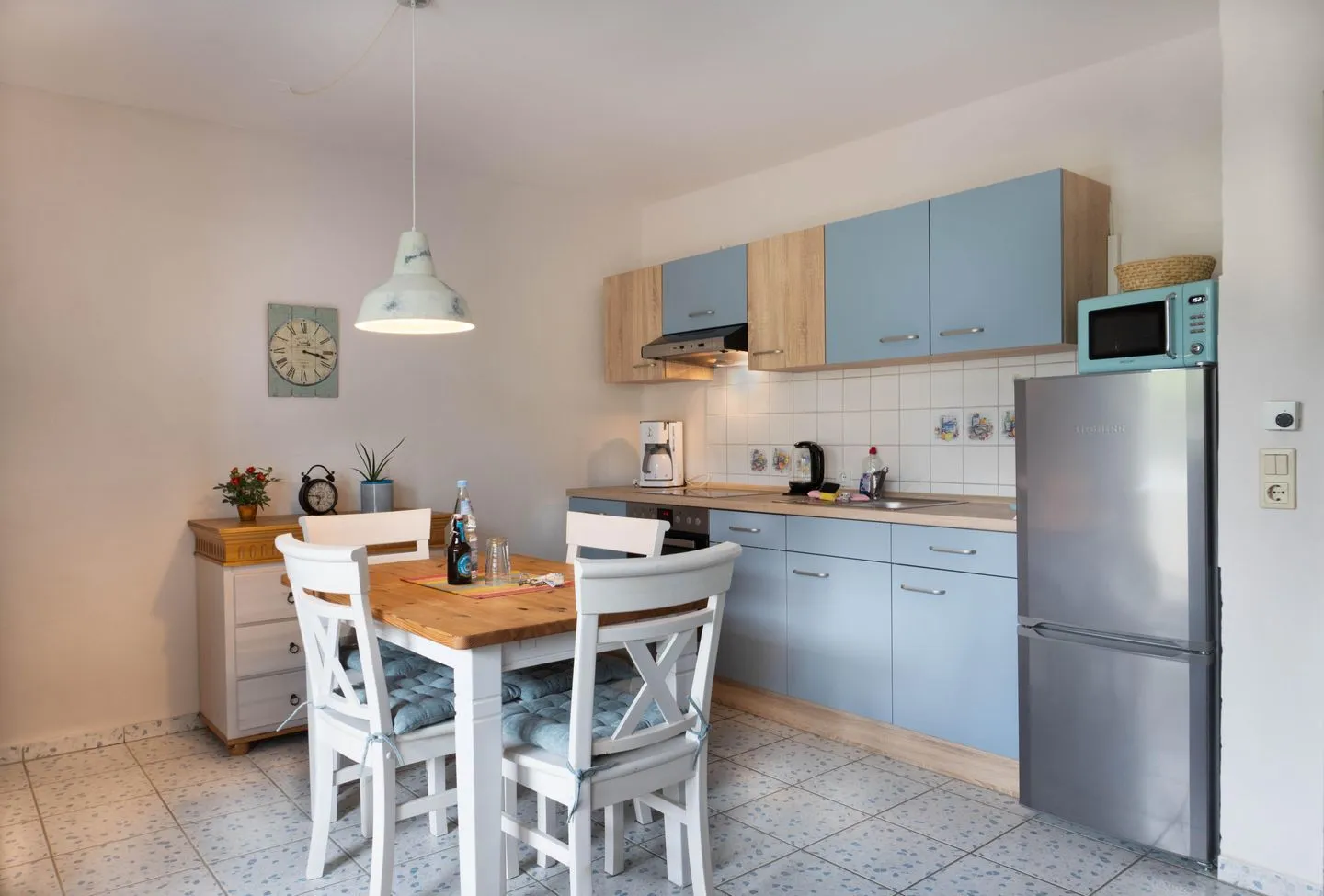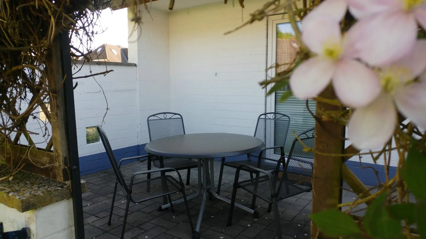 Das Wohn-und Esszimmer mit integrierter, voll ausgestatteter Küchenzeile ist funktional und doch gemütlich eingerichtet und verfügt über einen Ausgang zur wohnungseigenen großen Nordwest-Terrasse mit kleiner Pforte in den vollständig eingezäunten,mit der Nachbarwohnung gemeinschaftlich genutzten Garten, sodass unsere Gäste mit Hund sich entspannt zurücklehnen können und nicht befürchten müssen, dass sich Ihr Vierbeiner eigenständig in der Nachbarschaft umschaut.